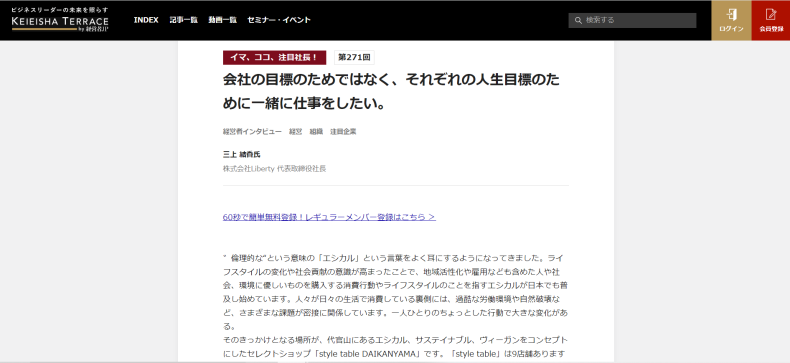 代表の三上結香がビジネスリーダーの未来を照らす「KEIEISHA TERRACE」に掲載されました メディア 2022.12.05 出典:KEIEISHA TERRACE公式サイト「会社の目標のためではなく、それぞれの人生目標のために一緒に仕事をしたい。」記事より 株式会社 経営者JPが運営する、経営や経営戦略などについてまとめられている会員制サイト「KEIEISHA TERRACE」。そこに代表三上が紹介され、起業への経緯や、今大切に思っていることについて掲載されました。 ▼記事はこちらhttps://www.keieishaterrace.jp/article/detail/20045/